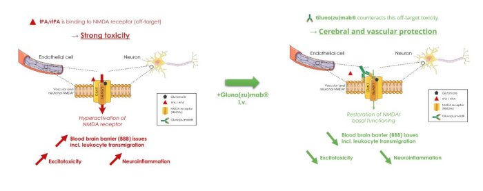 By blocking the tPA-NMDAr interaction, Glunomab / Glunozumab® counteracts this tPA-dependent strong toxicity, without interfering with physiological NMDAr functioning.