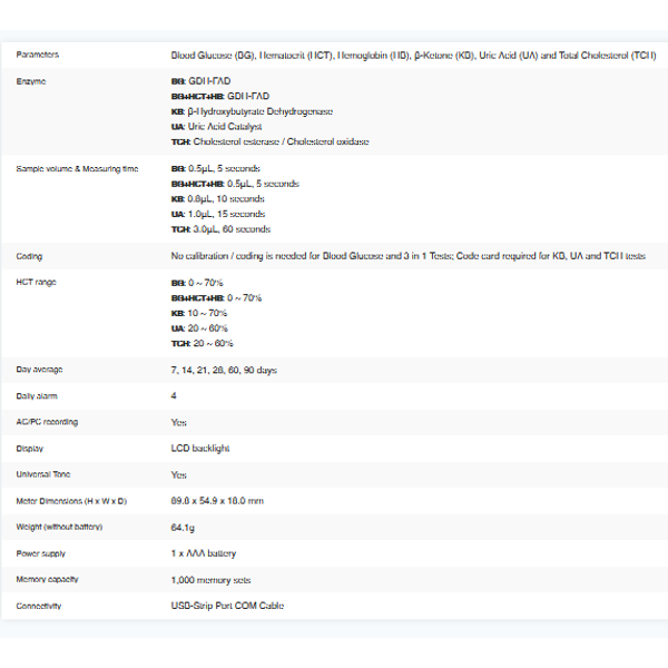 Has 5 test strips and measures six parameters, blood glucose (BG), hematocrit (HCT), hemoglobin (HB), β-ketone (KB), total cholesterol (TCH) and uric acid (UA)