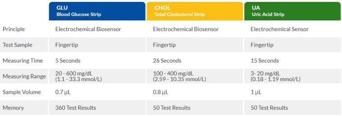 - Glucose, Cholesterol, Uric Acid