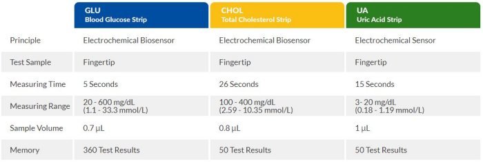 - Glucose, Cholesterol, Uric Acid