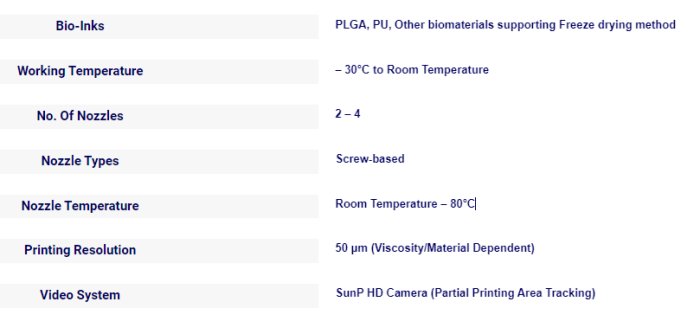 Through layered printing, complex 3D tissue scaffolds can be produced. Additionally, scaffolds can undergo post-treatment with freeze-drying to obtain multi-level pores and improve its cell seeding density, which significantly enhances cell growth within the scaffold. In addition, this printer uses high-precision screw nozzles to print biomaterials with high viscosity while preserving its desired architectural features. It also has a HD video system that can record and track the print area.