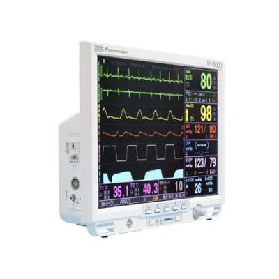 ECG / SpO2 / 2-IBP / NIBP / RESPIRATION / 2-TEMP / ETCO2. 15 inch Widescreen (16:9) TFT Color LCD with ultra-wide. Provides 7 parameters with 6 waveforms. Waveforms are able to be selected from 3 to 5 according to customer’s use. Detects 12 types of ECG arrhythmia and displays PVC and ST Level. Sidestream EtCO2 module and printer can be built in the equipment as an option. Changeable color and wave display configuration. Optional touch screen. Operates for around 3 hours on a charged battery.