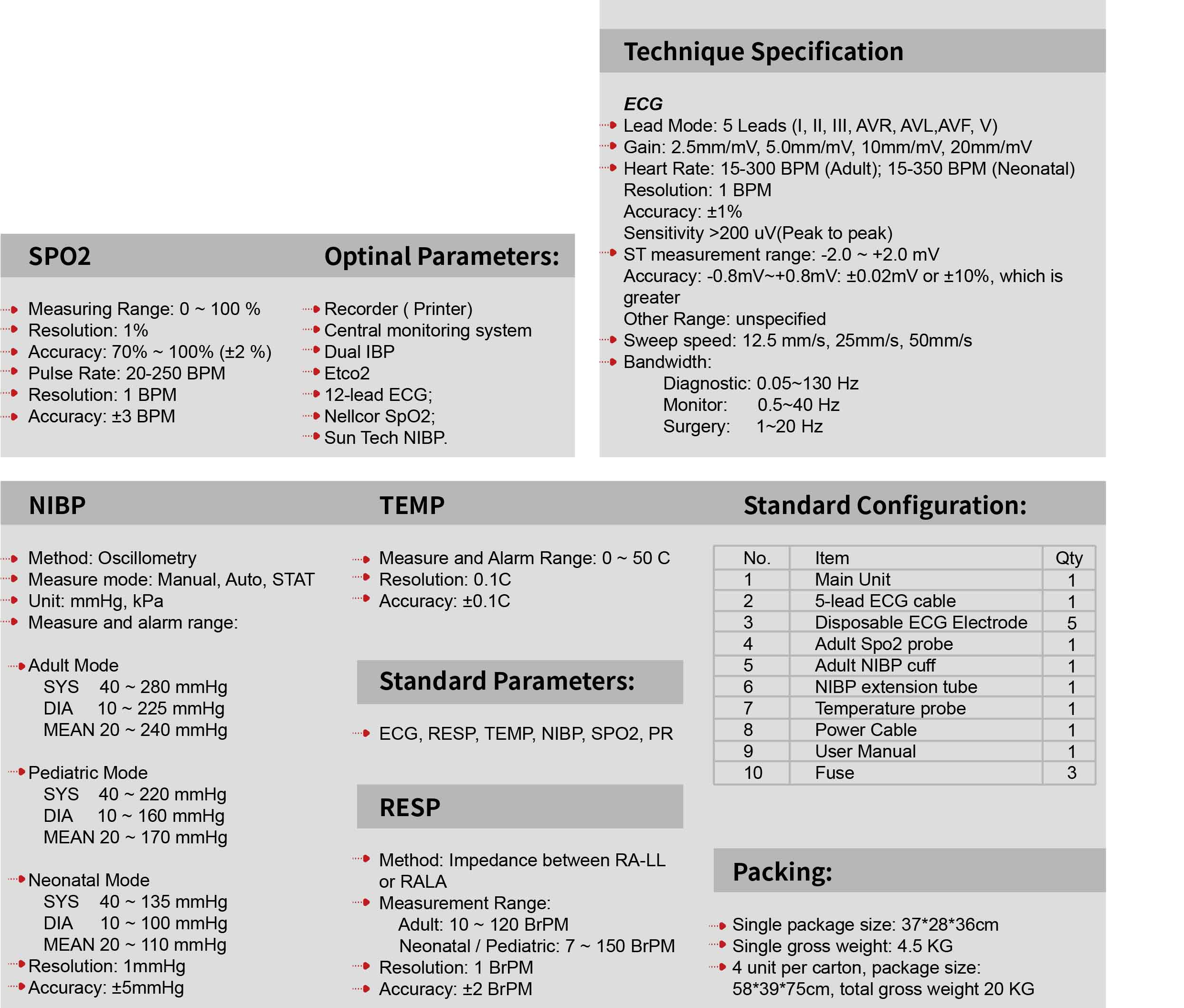 Touch-screen for easy operation. 12.1 inch high resolution color TFT display. USB interfaces support easy software upgrade and data transfer. Compatible with Central Monitoring System (CMS). Three Working Modes: Monitoring, Surgery and Diagnosis. Simple and friendly operating display interface. Multi-display modes suitable for different applications: Standard Interface, Large font, ECG Standard Full Display, OXY , Trend Table, BP Trend. Built-in high capacity battery up to 3 hours of continuous work. VGA output for external display.