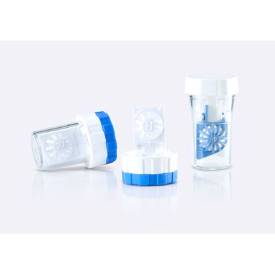 Primary packaging material and cleaning container for contact lenses. Based on an idea from our customer, we were commissioned with the design and implementation of a multi-part system for secure storage and cleaning of contact lenses. In accordance with all requested functional, purity and compatibility requirements, we took over the complete development, design, toolmaking, manufacture and component assembly in our in-house ISO 7 clean room. Thanks to the correct material selection, the characteristics of the processed plastics are optimally matched to the application as primary packaging material. Special attention was paid here to the prevention of interactions of the contact lens holder with the cleaning liquid and the contact lens. Optional coloring of the storage trays make distinguishing the individual lenses easier for the contact lens wearer.
