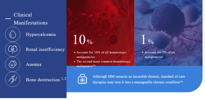 Multiple myeloma is caused by the dysregulated proliferation of plasma cells, characterized by the proliferation of monoclonal plasma cells that results in an overabundance of monoclonal immunoglobulin or its fragment (M protein). Clinical manifestations of MM include hypercalcemia, renal insufficiency, anemia, and the destruction of the bone. 1,2 MM primarily occurs in the elderly population. In the Chinese population, MM is the second most common hematologic malignancy, 3,4 with a median age of onset of 59 years1 and an incidence rate of 1.46 per 100,0004 that is lower than that of western countries. Although MM remains an incurable disease, the introduction of new therapies and diagnostic tools have led to significant advances in the clinical management of MM. The current standard of care therapies for MM include proteasome inhibitors, immunomodulatory agents, monoclonal antibodies and XPO1 inhibitors.
