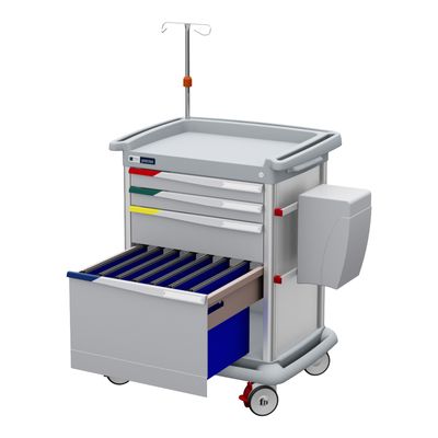 One PRECISO trolley to meet different needs: therapy administration and patient files management. 2 smaller FH-Drawers (1 module), one 2 module FH-Drawer and a drawer for hanging patient files folders are complemented by a knee-operated WALLY dustbin and an IV pole. Assembled structure with anodized aluminium walls and posts / powder coated walls (for colours other than grey). Additional pull-out surface on the right side. Wide worktop in ABS injection mould, pearl-grey color. Innovative push handles on three sides – rounded edges and containing rims. Base in injection moulded ABS grey plastic, with all-round bumper. FH-Drawers on telescopic frames. Centralized Keylock.