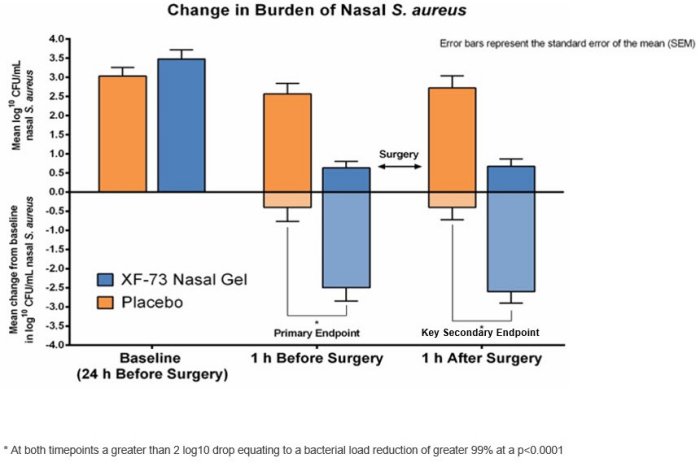 The primary efficacy endpoint of the Phase 2b study was met, with an exceptionally high statistical significance and XF-73 nasal gel reduced the mean nasal burden of Staphylococcus aureus in patients undergoing open heart surgery by 2.5 log (CFU/ml) in the 24 hours immediately before surgery, which equates to a 99.5% reduction in Staphylococcus aureus bacterial nasal carriage, which is a very effective reduction by accepted clinical measures. These positive results were achieved with just four doses of XF-73 nasal gel in the 24 hours before incision and the start of surgery. XF-73 also showed a 2.1 log, (>99%), greater reduction than placebo in the same patient population and the effect was maintained during surgery, considered the period when the risk for infections is the highest.