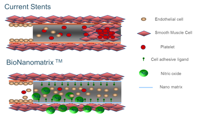Our endothelium mimicking nitric oxide releasing BioNanomatrix, initially developed for coronary and peripheral stents, is being assessed for several novel applications including: