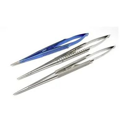 Available models of needle holders: Needle holders with a round handle with a standard grip serration and a “golf ball” handle; Needle holders with a flat Castroviejo handle, The working parts of the above mentioned needle holders are in a straight or bent form. They are diamond coated for a better needle grip. Titanium models are available with stainless steel locks. Such needle holders combine all the advantages of titanium and steel properties, ensuring smooth and stable operation of the lock during treatments. Hegar type needle holders with hard insert, various lengths and part sizes; working.