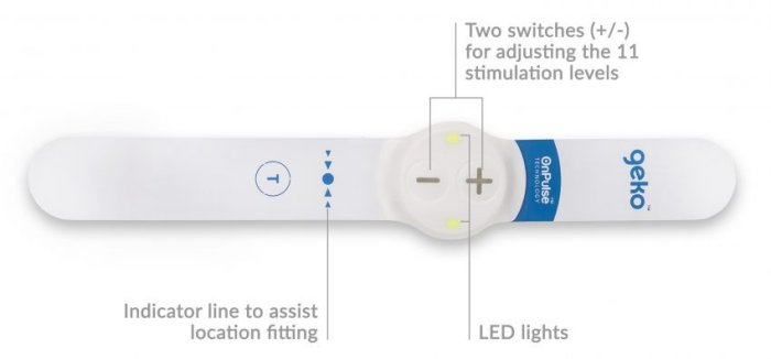 The geko device, powered by OnPulse neuromuscular electrostimulation technology, is clinically proven to increase blood flow1 to help prevent and treat a range of acute medical conditions. The size of a wrist watch and worn at the knee, the battery powered, daily disposable geko device gently stimulates the common peroneal nerve activating the calf and foot muscle pumps, resulting in increased blood flow in the deep veins of the calf.