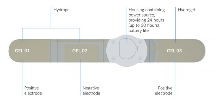 OnPulse™ low frequency nerve stimulation delivers current transcutaneously via non-invasive skin surface electrodes placed on the common peroneal nerve that winds around the neck of the fibula bone, behind the fibula head, with conductive hydrogel to facilitate adhesion and the movement of the current from the electrode into the skin.