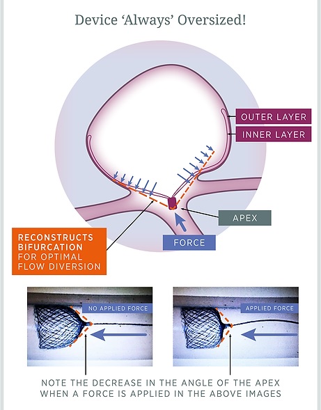 - Provides a combination of flow diversion at the neck of the aneurysm and flow disruption within the aneurysm sac;
