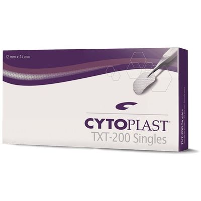 Often praised for their predictability, Cytoplast™ TXT-200 and TXT-200 Singles are manufactured from high-density PTFE, which is engineered to withstand exposure. This key feature, coupled with the Cytoplast™ Technique for grafting extraction sites, offers the ultimate in both predictability and esthetics during dental bone grafting procedures. For this reason, the TXT-200 Singles are our most popular membranes for socket grafting. By avoiding releasing incisions and displacement of keratinized tissue often associated with obtaining primary closure in socket grafting, clinicians preserve soft tissue architecture and keratinized tissue.