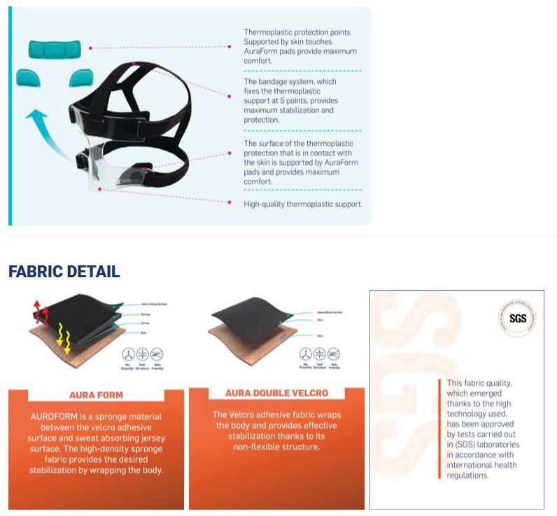 It is made of plastic material and the surface contacting the skin (Auraform) is made of fabric and is used to protect the nose from trauma. Used for protective purposes in sports such as basketball, wrestling, karate, baseball, football, volleyball and nasal surgeries.