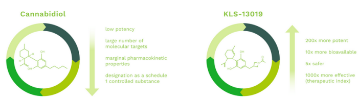 We have made significant improvements in the chemistry efficacy and safety of our CBD-like molecules, lead by KLS-13019, that are up to 200X more potent, 10X more bioavailable, 5X safer and 1000 times more effective than CBD.