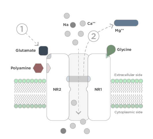 (1) Presynaptic release of glutamate causes neuronal membrane depolarization and release of the physiologic magnesium block (2). Sodium and calcium flow into the neuron. Calcium is especially relevant because if the channel remains open too long it can cause functional impairment and even death of the neuron (apoptosis).