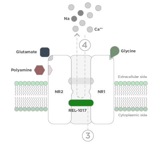 (3) REL-1017 enters the NMDAR channel only when the NMDAR channel is hyperactive. By positioning itself in the center of the open channel, REL-1017 effectively blocks the entry of excessive amounts of calcium into the neuron (4).