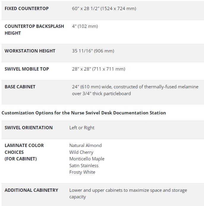 The Nurse Swivel Desk Documentation Station features a rotating mobile work surface to allow nursing staff to position themselves to have a direct line of sight to the patient. This operating room documentation station is designed with a large fixed white countertop work surface, easy to clean laminate finish, and a base cabinet with a 24" wide opening, adjustable shelf and cord pass-through outlets.