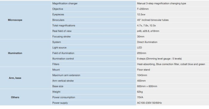 LED light source provides a solution to the issue of bulb burnout as well as offering significant energy savings; a power consumption reduced by 85% in comparison with our previous model. The life of LED is defined as the state when the light intensity decreases to 70%, and the life of the LED used in this operating microscope is about 40,000 hours. However, 40,000 hours cannot be guaranteed.