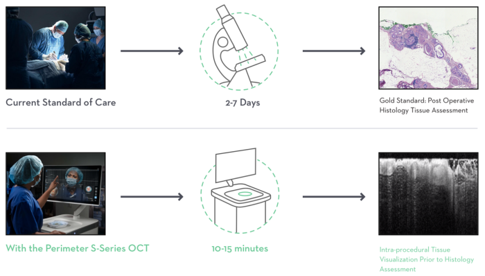 Perimeter S-Series OCT fits seamlessly into your existing workflow. The device itself is portable, so it can be moved into any OR that’s being used for a tissue excision procedure. Scan times are 1-2 minutes per margin or 10-15 minutes overall with interpretation. While it does not replace standard histopathology, OCT provides valuable insights when and where surgeons need to make informed decisions.