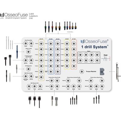 The Osseofuse Master Kit is a comprehensive surgical kit designed for clinicians, offering all the necessary instruments in an affordable, portable, and organized manner. It is notable for being the only patented full dental implant kit on the market that features one platform compatible with all sizes of abutments, ranging from 3.75 to 7.5 mm. The key advantage of Osseofuse's design is that a single connection fits all Osseofuse implants within this size range. The implants have an RBM surface, are not sterile, and are self-tapping with platform switching. Specific details like diameter, abutment length, total length, cuff height, and length in millimeters are part of the kit specifications, though exact numbers were not provided in the description available. The kit also has a cancellation policy related to refund percentages for event cancellations. This entire setup aims to provide an efficient and versatile implant solution for clinicians.