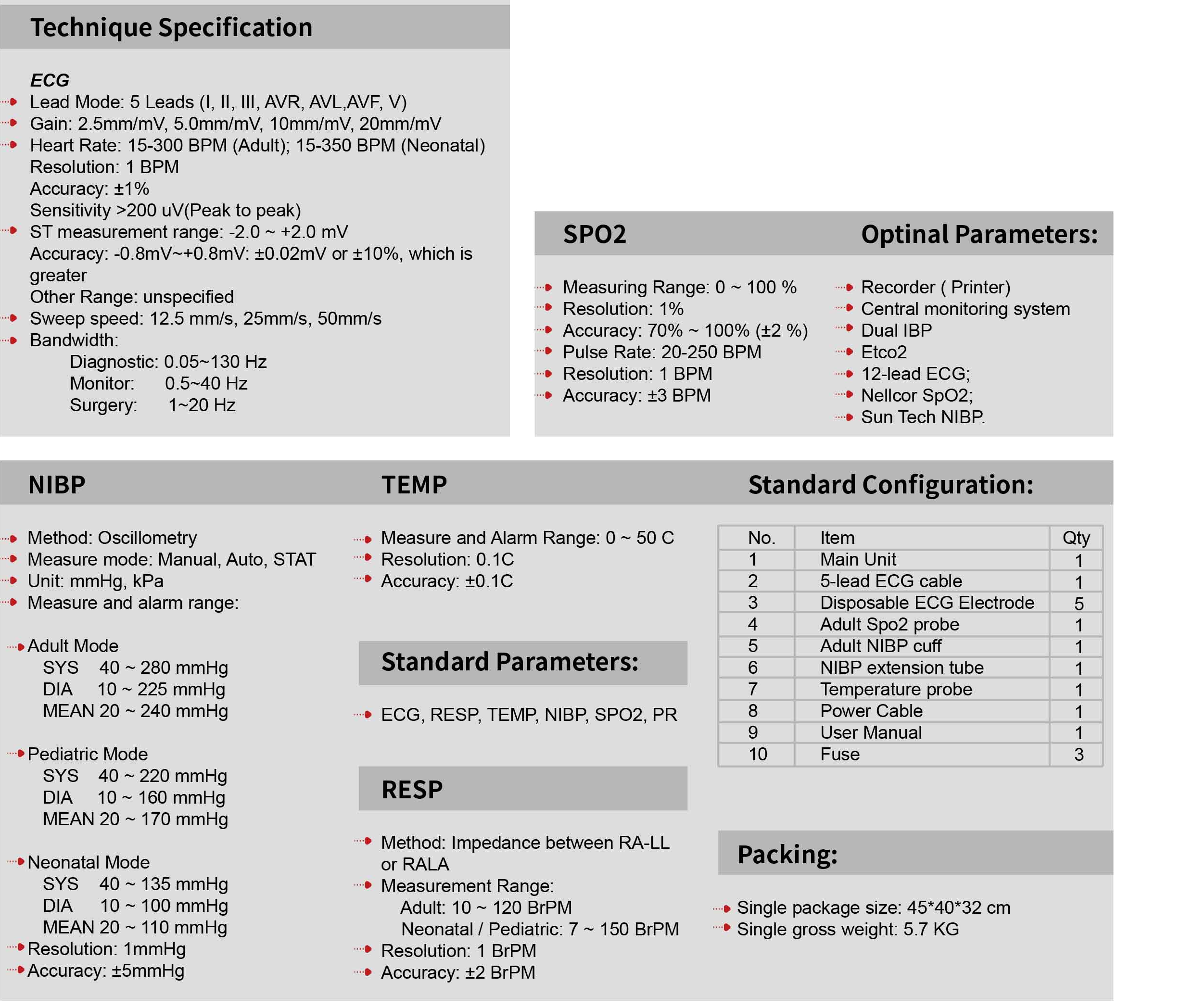 15.6 inch large screen for viewing convenience. Three Working Modes: Monitoring, Surgery and Diagnosis. Simple and friendly operating display interface. Multi-display modes suitable for different applications: Standard Interface, Large font, ECG Standard Full Display, OXY , Trend Table, BP Trend. Built-in high capacity battery up to 3 hours of continuous work. VGA output for external display.