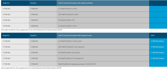 Available in four cuff sizes to fit the limbs of neonates to adolescents and provide maximum surgical exposure on small limbs. Both reusable and sterile single-use cuffs are available in single and dual port configurations.
