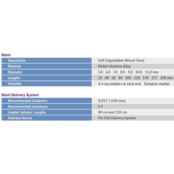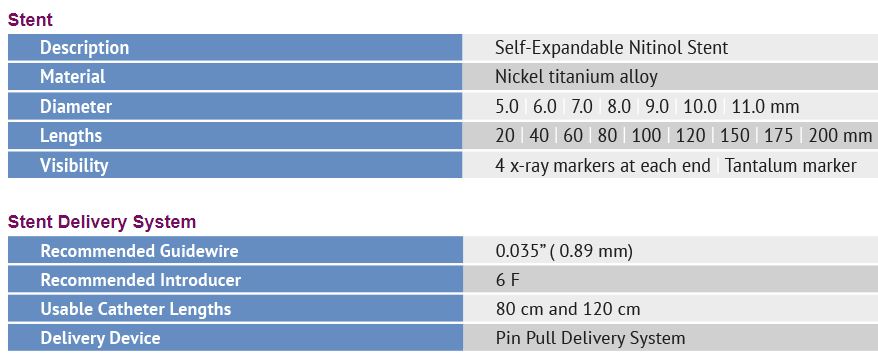 - Nitinol Stent with tantalum markers provides excellent visibility under fluoroscopy