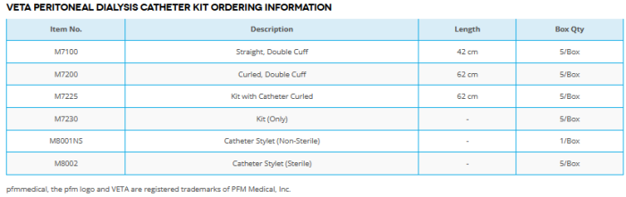 The VETA Peritoneal Dialysis Catheter Kits are indicated for acute and chronic access to the peritoneal cavity and provide the necessary items for catheter insertion into the peritoneal cavity. The VETA Peritoneal Dialysis Catheters is used to infused and drain fluid during peritoneal dialysis procedures.