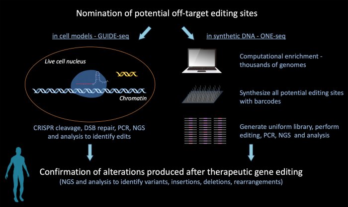 GUIDE-seq and ONE-seq are used to nominate potential off-target editing sites in cellular models and free DNA, respectively. ONE-seq has the advantages that it can be used to assess adenine and cytosine base editors, it allows variant-aware analysis of multiple genomes simultaneously (thousands), and it detects a broader spectrum of off-target sites. Target cells or tissues are then tested to confirm which of the nominated sites are altered after therapeutic gene editing.