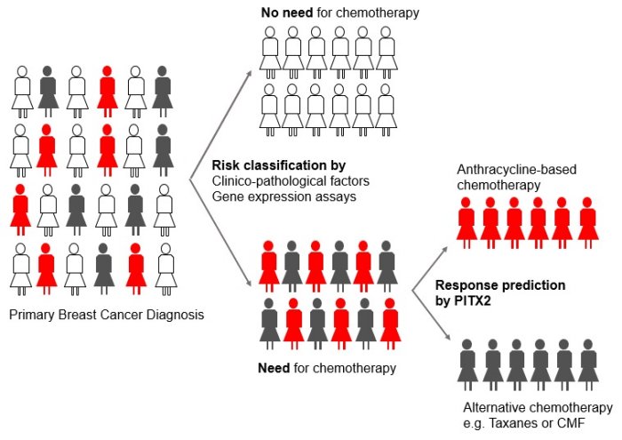 Selection of the right patients for anthracycline-based chemotherapy vs. alternative chemotherapy (e.g. DC or P or CMF) is now supported by the PITX2-assay. The assay provides information to the treating physician, which patients are likely to benefit from anthracycline-based chemotherapy and which are not.