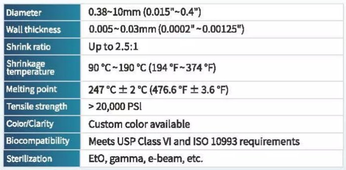 Application scenarios: Thanks to ultra-thin wall, extremely high tensile strength and excellent biocompatibility, PET heat shrink tubes are used for insulation, protection, rigidity, sealing, fixation and strain relief of medical devices without significantly adding to the profile of medical devices.