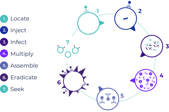 Phages target and rapidly kill their bacterial hosts by amplifying inside these bacteria and consequently releasing new phage by bursting through the host cell membrane into the surrounding environment. These newly released phage infect and kill additional nearby bacterial cells in a reiterative process that leads to elimination of the target bacteria