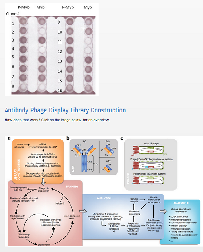 The image below shows the results of screening for a phospho-peptide specific scFv in one of our antibody phage display libraries. Four individual clones recognized the phospho-peptide (P-Myb) but not the un-phosphorylated peptide (Myb).