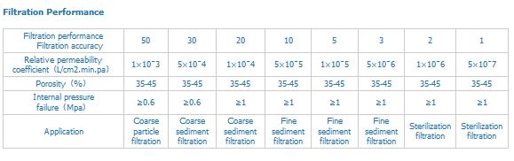 Filtration accuracy 0.22μm 0.45μm 1μm 3μm 5μm 10μm 20μm 30μm 50μm. Length(Inch) 10"20"30". Porosity 28-50%. Compression strength 0.8Mpa. Temperature resistance ≤300℃(Wet). Max operating pressure 0.6Mpa. Interface 222 226 M20 Thread. O ring material Fluorine rubber, silicone rubber, ethylene propylene rubber.