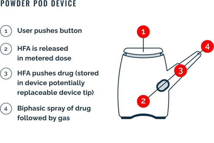 Impel Pharmaceuticals has developed a proprietary drug delivery technology system that targets the vascular-rich upper nasal space,1 with multiple clinical trials suggesting rapid absorption and consistent drug bioavailability with ease of use in mind for a patient, provider or caregiver. Impel Pharmaceuticals proprietary Precision Olfactory Delivery (POD®) technology has the potential to lead to injection-like bioavailability, which may improve clinical outcomes non-invasively.