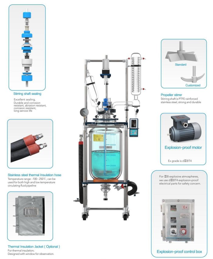 Speed-regulation glass reactors are mainly used for synthetic reaction, distillation and concentration of different types of materials. The reactor can be pumped to a negative pressure state according to some experimental requirements. A constant pressure funnel or an adjusting valve on the feeding bottle allows you to add material to the vessel at a uniform and controlled speed. Condenser helps to recover some materials distillated during reaction.