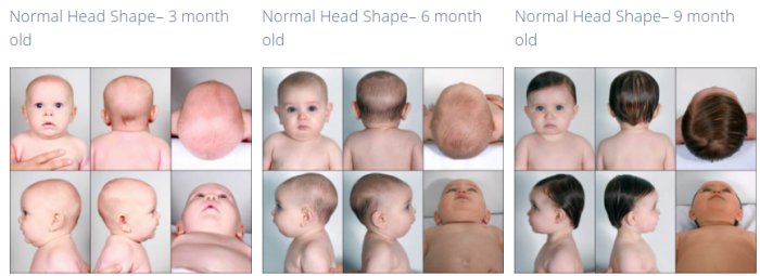 Parents spend so much time with their baby, recognizing an abnormal head shape can sometimes be difficult. We’ve found it can be helpful to see examples of a normal head shape before looking at abnormal ones. Normally, the head is about 1/3 longer than it is wide and rounded at the back. Below are some examples of a normal head shape at three months, six months and nine months old.