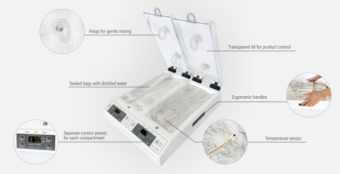 - Dry thawing and warming technology (no direct contact with water) eliminates the risk of bacterial contamination