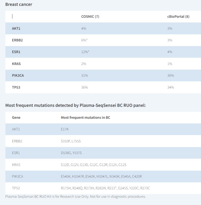 For the configuration of the Plasma-SeqSensei BC RUO kits, six key cancer genes were selected after comparison of mutation frequencies using the COSMIC (Catalogue of Somatic Mutation in Cancer) and cBioPortal for cancer genomics databases.