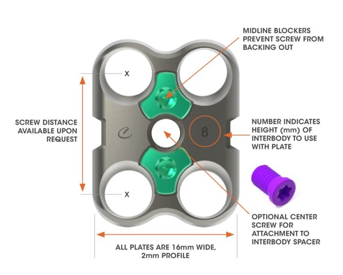 The ALTIVO 4H Plate Anterior Cervical Fixation System provides anterior fixation with Camber Spine cervical interbody spacers.