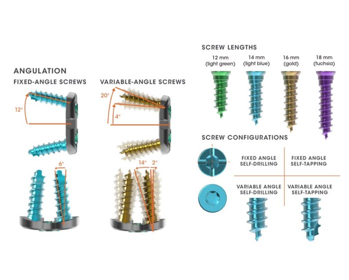 - Fixed or variable angle, self-tapping and self-drilling titanium alloy screws