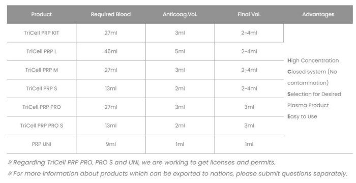 TriCell PRP is a product used to separate a buffy coat layer containing a large number of platelets from a blood sample. As the kit consists of three parts, TriCell PRP can separate and concentrate plasma or platelets from blood through two centrifugation processes using each cell.