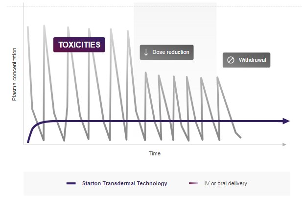 Our continuous dermal delivery systems use an adhesive patch to deliver medicine through the skin. The delivery is a controlled, sustained release over multiple days. Starton uses proven transdermal and subcutaneous technologies to transform approved medicines – establishing superiority or new indications. Starton is focused on flattening the plasma concentration curve to reduce dose-limiting toxicity and deliver improved efficacy.