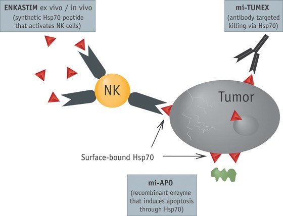 Based on its discovery of membrane Hsp70, multimmune has succeeded in developing a powerful product, termed ENKASTIM which allows, for the first time, a unique and specific activation of human natural killer (NK) cells which are programmed to recognise and kill cancers expressing membrane Hsp70 via the release of a cytotoxic molecule called granzyme B. These cells destroy tumors and metastases that are invisible to the cell killing (cytolytic) consequences of more conventional T cell-based immunotherapies.