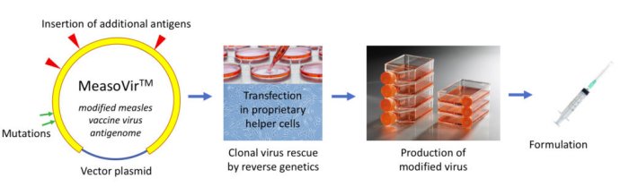 MeasovirTM has been constructed by deletion of a viral factor which normally controls apoptosis of infected cells. Its increased capacity to induce immunogenic cancer cell death is linked to its strong RIG-I agonist activity (RIG-I is a cytoplasmic RNA receptor whose activation is critical for responsiveness to checkpoint blockade in cancer). MeasovirTM platform has been patented (granted in US and Europe for treatment of all types of cancers).