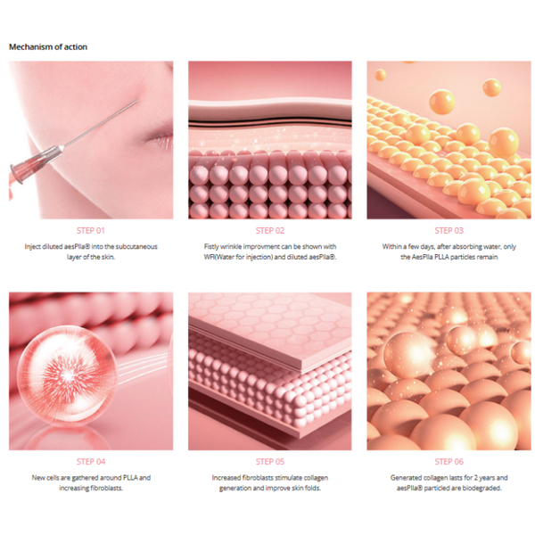 Injected AesPlla PLLA Filler restores volume through stimulation collagen in the skin layer. Generated boiume with own collagen lasts more than 2 years.