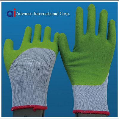 Liner: polyester and cotton. Coating: natural latex, crinkled finish. Size: 7/S, 8/M, 9/L, 10/XL.