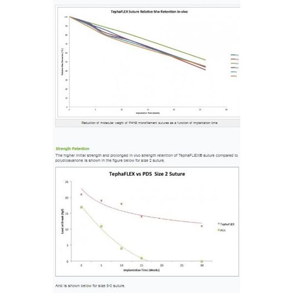The degradation of monofilament sutures following subcutaneous implantation has been investigated in a number of studies. The trend in loss of molecular weight shows that it approaches zero by approximately 52 weeks. At that timepoint fragments of fiber can still be seen, generally of insufficient quantity to be retrieved for testing. Additionally, the data shows that the Mw loss over time is similar for all suture sizes tested and is independent of size from approximately 0.15 µm diameter to approximately 0.8 µm diameter. These data are shown in the plot below for different sizes of suture.