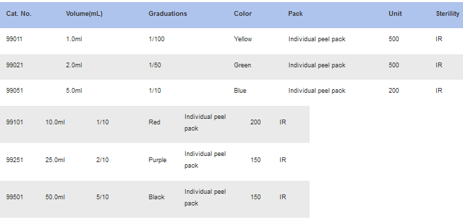 Manufactured from virgin polystyrene are ideal for accurate liquid transfer or mix. Management system EN ISO13485 with SOPs and 100,000 grade clean-room guarantee quality. Available with 6 capacity of 1.0, 2.0, 5.0, 10.0 , 25.0 and 50.0ml The 1ml, 2ml and 5ml are a one piece construction and the 10ml, 25ml and 50ml pipets are made with a durable ultrasonically welded 3 piece construction. Clear black printing guarantee maximum an accuracy of ±2%. It benefit from having descending & ascending graduations to help pipetting and negative graduations for extra capacity. Pipettes are color coded according to the international standards to simplify identification. All pipettes are supplied with a cotton plug for protection against the suction of liquid into the pipetting device. Serological Pipets are supplied gamma radiation, available with bulk package or in a paper/plastic bag. Inner packaging is individually labelled Lot-to-Lot traceability.